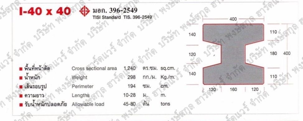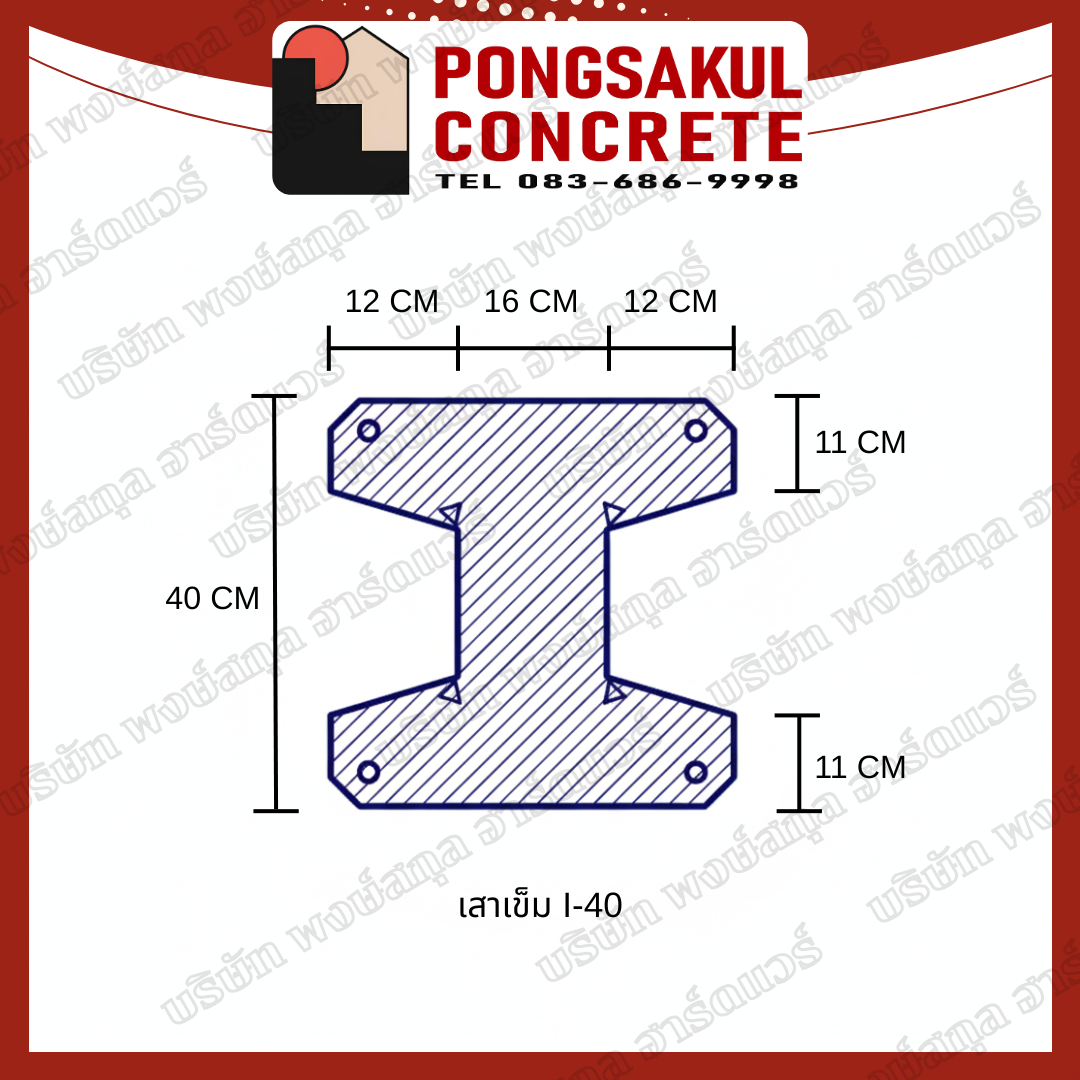 เสาเข็มไอ 40 คือ เสาเข็มคอนกรีตอัดแรงหล่อสำเร็จ หน้าตัดรูปตัวไอขนาดใหญ่พิเศษ 400 x 400 มม. จำหน่ายด้วยตัวแทนจำหน่าย ที่มีจำหน่ายทั้งรายการ มาตรฐานโรงงาน และ มอก.จากโรงงานที่ได้รับมาตรฐาน
